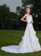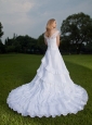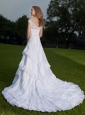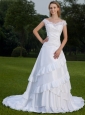 This fabulous wedding dress features a sweetheart neckline, the outlayer beaded lace makes the dress a half-cap neckline, the waist was slightly ruched, the layers in the skirt and the chapel train make the dress like a blooming flower, wear this dress and you will be a shinning dress in your wedding.