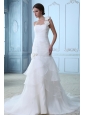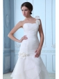 Home >  Wedding Dresses >  Latest Wedding Dresses > Modest A-line One Shoulder Ruch and Hand Made Flowers Wedding Dress Court Train Organza