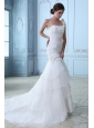 Modest A-line One Shoulder Ruch and Hand Made Flowers Wedding Dress Court Train Organza
