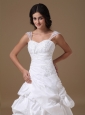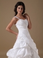 Home >  Wedding Dresses >  Elegant Wedding Dresses > Modest A-line Straps Court Train Taffeta Appliques Wedding Dress