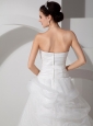 To be the most elegant bride in the world is the dream of every girl.With this fabulous wedding gown,your dream will come true. It features a lovely sweetheart neckline with pleated bust encrusted on the ruched bodice.layers of asymmetrical picks up of organza which gathered at the hip creates a vintage bubble look, the bottom part flows naturally to shape a chapel train.Pleated design on the back adds the charm, the classic hidden zipper up back secures the dress in place.