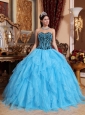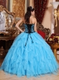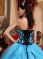 Fresh and soft! This fabulous sweetheart blue quinceanera dress is featured with the ruffles on the bottom of the dress. And the black bodice is entrusted with intricate beading and straight blue thin straps. The contrasting colors will make heads turn easily!
