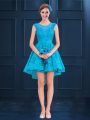 Modest Baby Blue Dama Dress for Quinceanera Wedding Party with Lace Scoop Sleeveless Lace Up