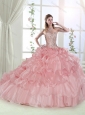 Modest Beaded and Ruffled Layered Baby Pink Sweet 15 Dress with Brush Train