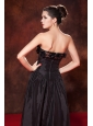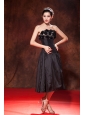Modest Black A-line / Princess Strapless Prom Dress Tea-length Taffeta Hand Made Flowers
