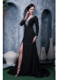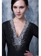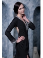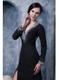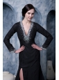 Feel confident and beautiful at your next special occasion in this beaded V-neck prom dress from Fashionos. This black long dress is perfect for any formal or semi formal occasion like prom with magnificent beaded detailing on the V neckline that creates a unique back design that is sensational. A long loose fitting skirt flows to the floor with a beautiful draped train that adds to the glamour. Long sleeves, low cut back and seductive side slit make this evening gown special.