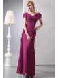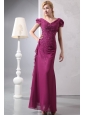 Modest Burgundy Column V-neck Prom Dress Ankle-length Chiffon Beading