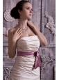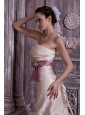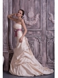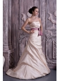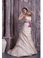 Modest Champagne Prom Dress A-line / Princess Strapless Belt and Beading Satin Brush Train