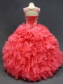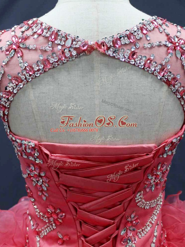 Home >  Quinceanera Dresses >  Fast Delivery Quinceanera Dresses > Modest Coral Red Organza Lace Up Ball Gown Prom Dress Sleeveless Floor Length Beading and Ruffles
