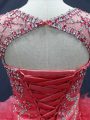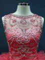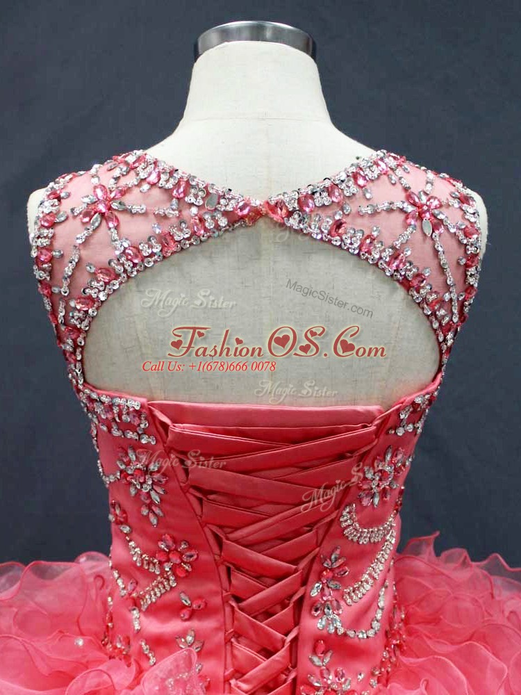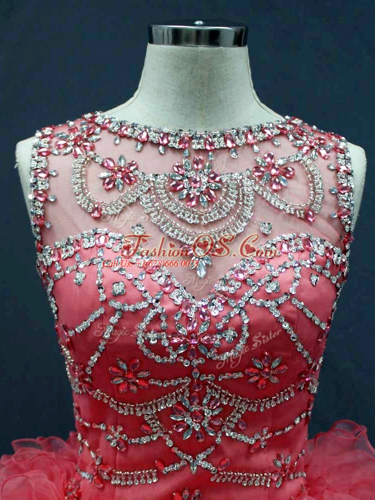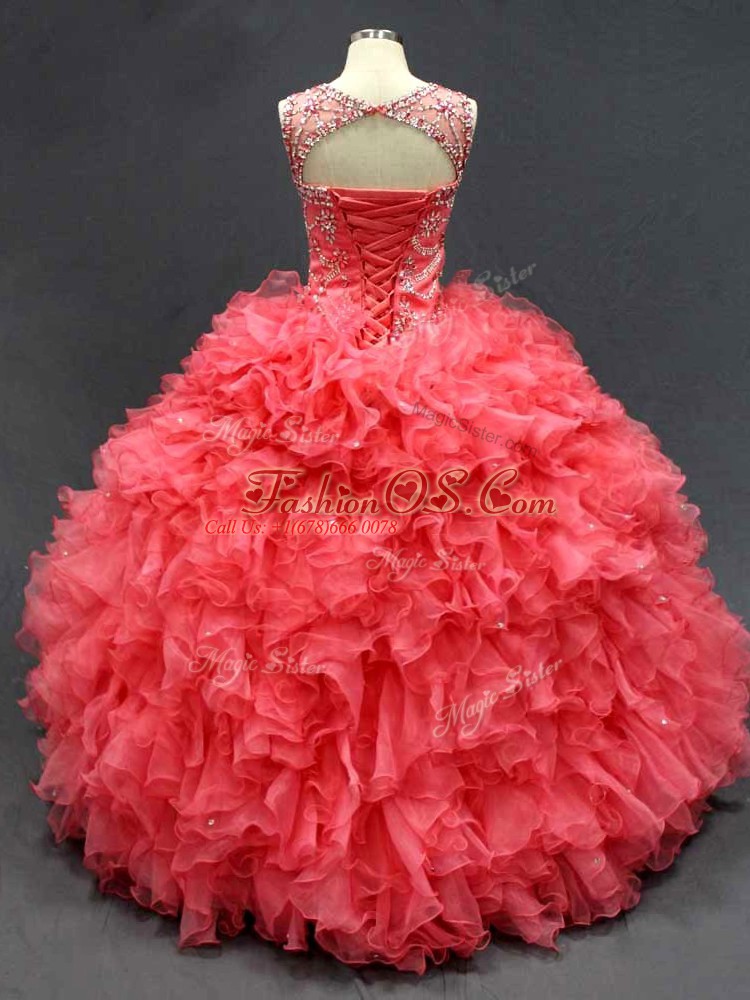 Modest Coral Red Organza Lace Up Ball Gown Prom Dress Sleeveless Floor Length Beading and Ruffles