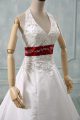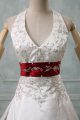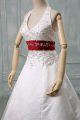 Home >  Wedding Dresses >  Low Cost Wedding Dresses > Modest Halter Top Sleeveless Satin Wedding Gown Beading and Embroidery Brush Train Lace Up