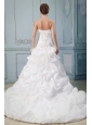 What a gorgeous wedding gown! This dress features a flowery encrusted by the embroidery and beading throughout. The bubbles on the top of the skirt adds more romance to the dress, while the pick-up skirt with a chapel train makes you walk elegantly. A lace up corset style closure in the back secures the dress in place.