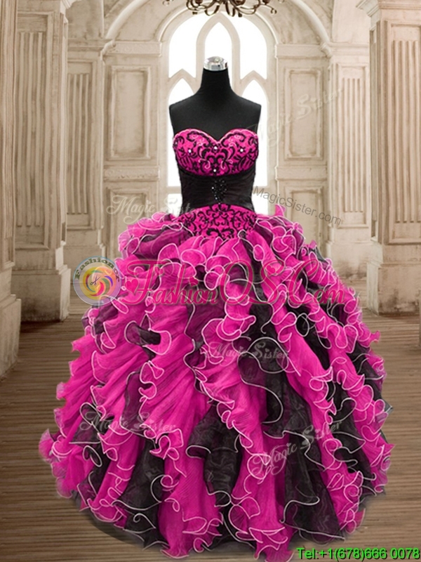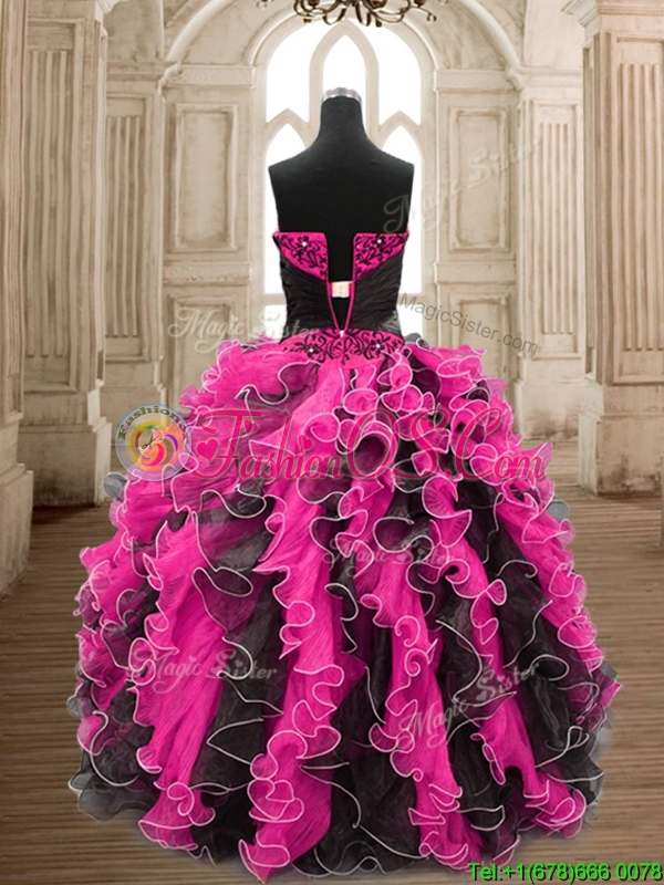 Home >  Quinceanera Dresses >  Fast Delivery Quinceanera Dresses > Modest Hot Pink and Black Quinceanera Dress with Beading and Ruffles