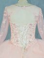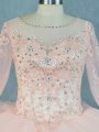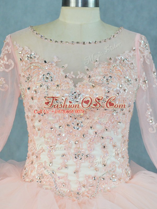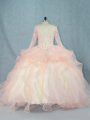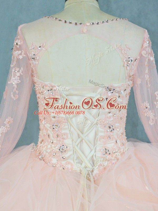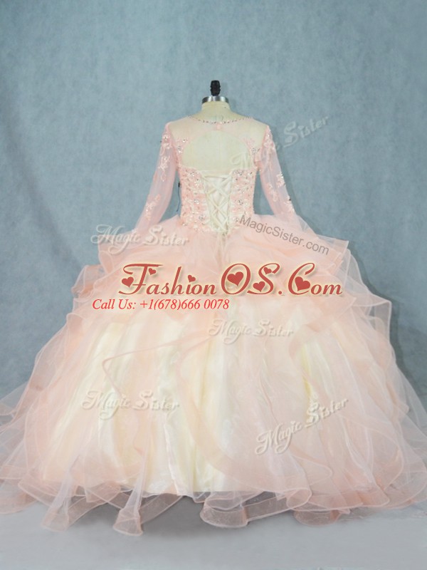 Modest Long Sleeves Floor Length Beading and Ruffles Lace Up Ball Gown Prom Dress with Peach