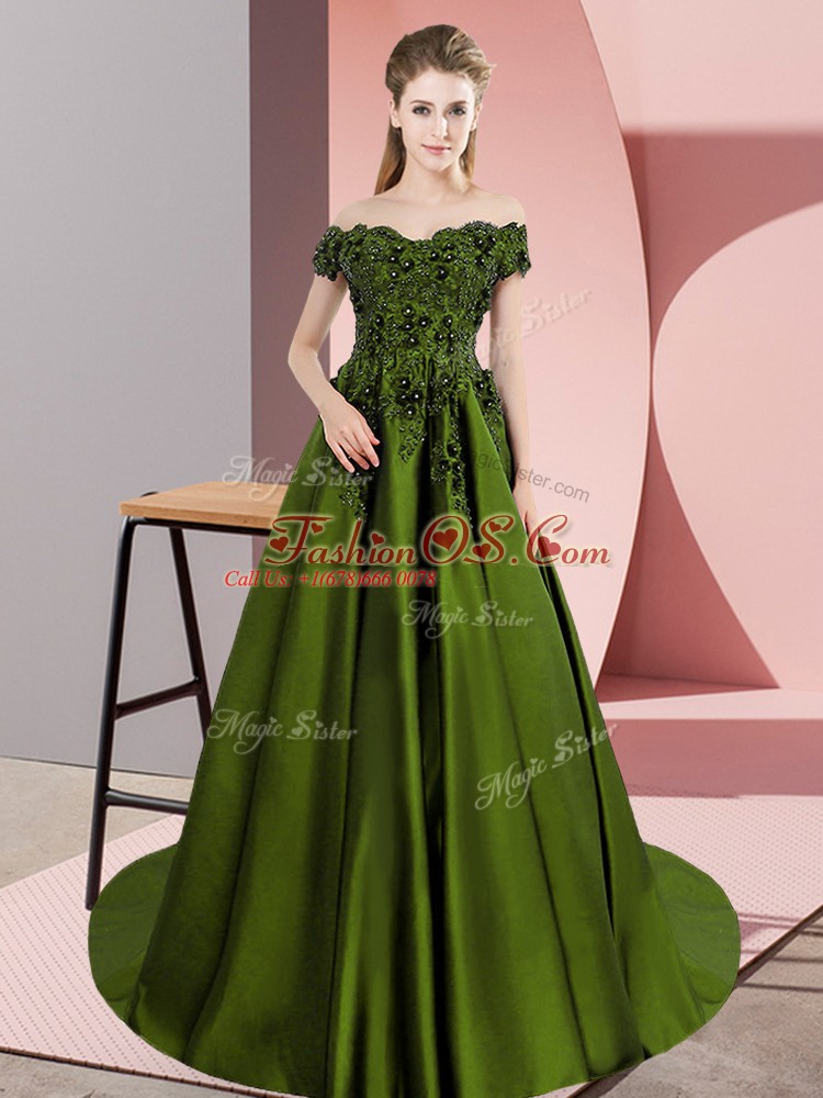 Modest Off The Shoulder Sleeveless Zipper 15th Birthday Dress Olive Green Satin