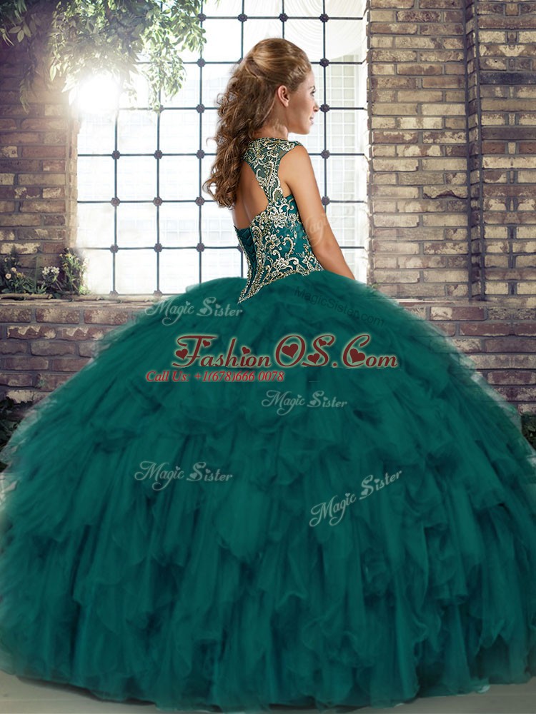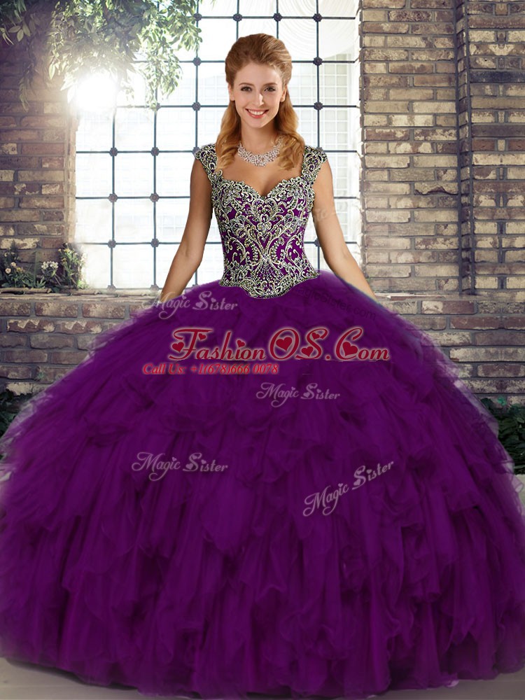 Modest Purple 15th Birthday Dress Military Ball and Sweet 16 and Quinceanera with Beading and Ruffles Straps Sleeveless Lace Up