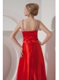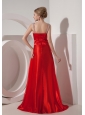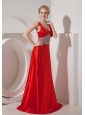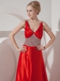Modest Red A-line V-neck Prom Dress Silk Like Satin Beading Brush Train