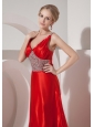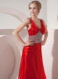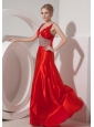 Home >  Prom Dresses >  Modest Prom Dresses > Modest Red A-line V-neck Prom Dress Silk Like Satin Beading Brush Train