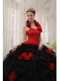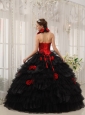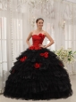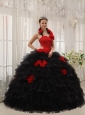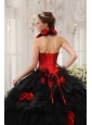 Home >  Quinceanera Dresses >  Fashionable Quinceanera Dresses > Modest Red and Black Quinceanera Dress Halter Taffeta and Organza Hand Flowers Ball Gown