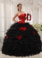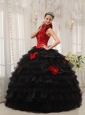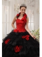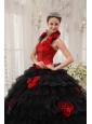 Modest Red and Black Quinceanera Dress Halter Taffeta and Organza Hand Flowers Ball Gown