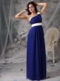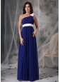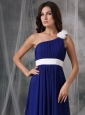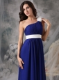 Modest Royal Blue and White Empire One Shoulder Prom Dress Chiffon Handle Flowers Floor-length
