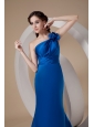 Modest Royal Blue Mermaid One Shoulder Prom Dress Satin Hand Made Flower Brush Train
