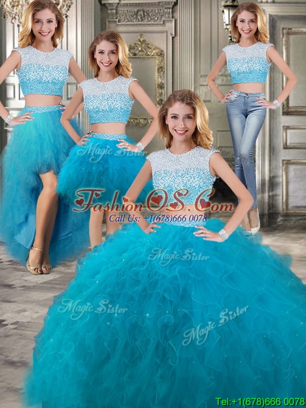 Home >  Quinceanera Dresses >  Detachable Quinceanera Skirts > Modest Scoop Cap Sleeves Teal Detachable Sweet 16 Dresses with Beading and Ruffles