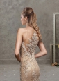 Modest See Through Scoop Mermaid Applique Evening Dress in Champagne