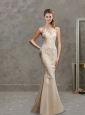 Home >  Evening Dresses > Modest See Through Scoop Mermaid Applique Evening Dress in Champagne