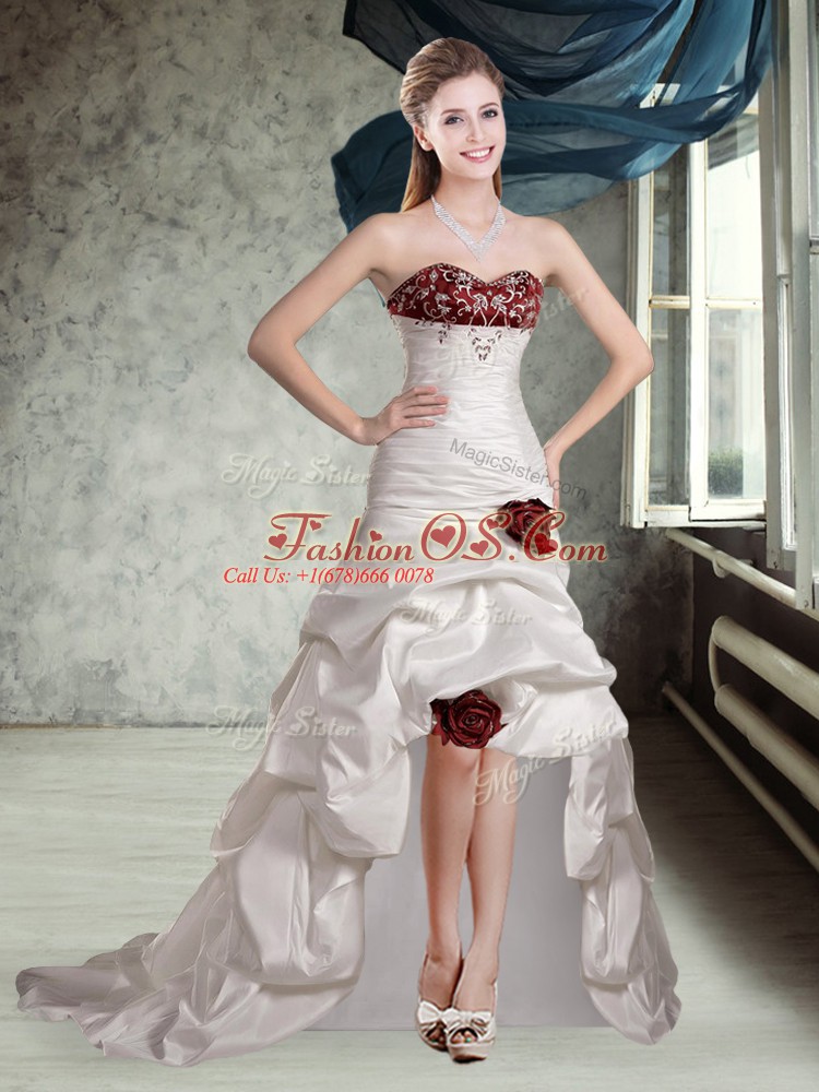 Modest Sleeveless Embroidery and Ruffles and Hand Made Flower Backless Wedding Dresses with White And Red Brush Train