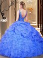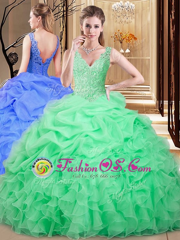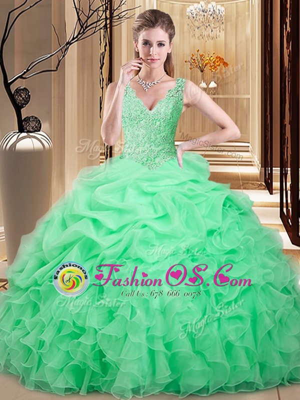 Modest Sleeveless Floor Length Lace and Appliques and Pick Ups Backless Quinceanera Gowns with Apple Green