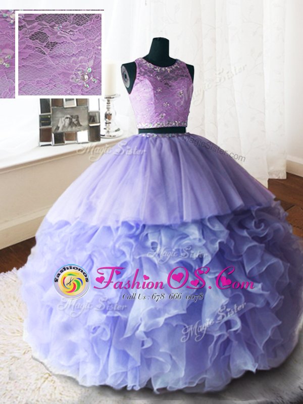 Modest Three Piece Lavender 15th Birthday Dress Military Ball and Sweet 16 and Quinceanera and For with Beading and Lace and Ruffles Scoop Sleeveless Brush Train Zipper