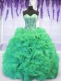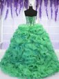 Warning: number_format() expects parameter 2 to be long, string given in /home/fashonos/domains/fashionos.com/public_html/includes/classes/currencies.php on line 52 Modest Turquoise Organza Lace Up Quinceanera Gowns Sleeveless With Brush Train Beading and Ruffles-