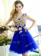 Modest V Neck Short Prom Dresses with Rhinestone and Appliques