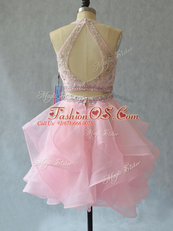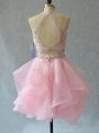 Most Popular Baby Pink Two Pieces Beading and Ruffles Prom Dresses Backless Tulle Sleeveless Mini Length