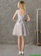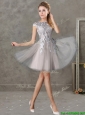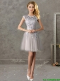 Most Popular Bateau Cap Sleeves Grey Prom Dress with Lace