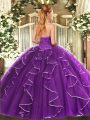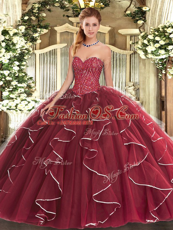 Most Popular Beading and Ruffles Vestidos de Quinceanera Burgundy Lace Up Sleeveless Floor Length