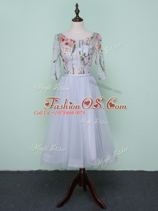Home >  Bridesmaid Dresses >  Perfect Bridesmaid Dresses > Most Popular Grey Lace Up Scoop Embroidery Bridesmaid Dress Tulle Half Sleeves