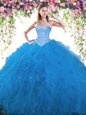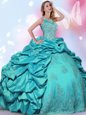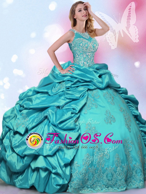 Home >  Quinceanera Dresses >  Fast Delivery Quinceanera Dresses > Most Popular Halter Top Sleeveless Floor Length Beading and Lace and Appliques and Pick Ups Lace Up 15 Quinceanera Dress with Teal