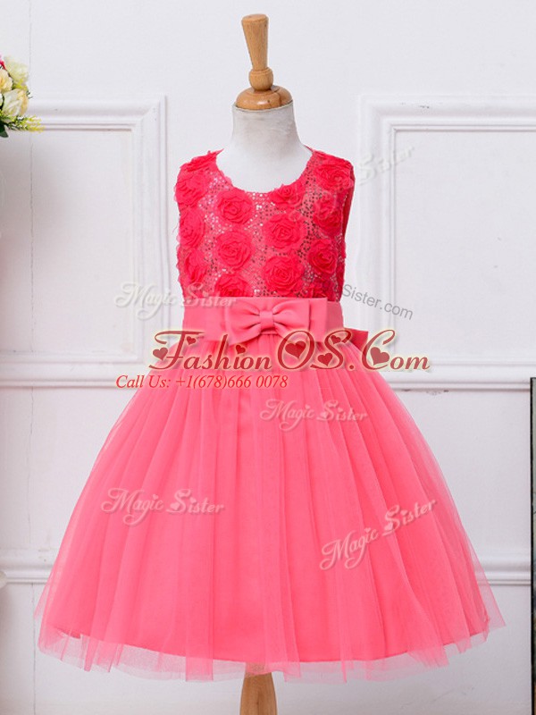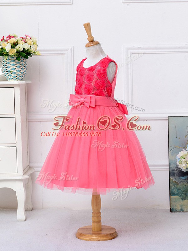 Most Popular Hot Pink Tulle Lace Up Little Girl Pageant Dress Sleeveless Knee Length Bowknot