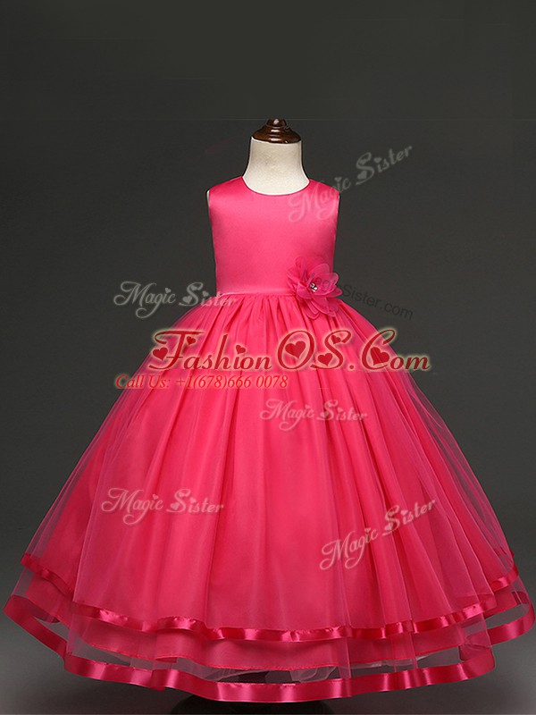 Most Popular Hot Pink Tulle Zipper Scoop Sleeveless Floor Length Little Girls Pageant Dress Wholesale Hand Made Flower