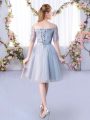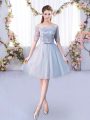 Most Popular Knee Length Grey Bridesmaid Dress Tulle Short Sleeves Lace and Belt