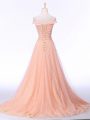 Home >  Evening Dresses > Most Popular Peach Sleeveless Beading and Lace and Belt Lace Up Evening Outfits