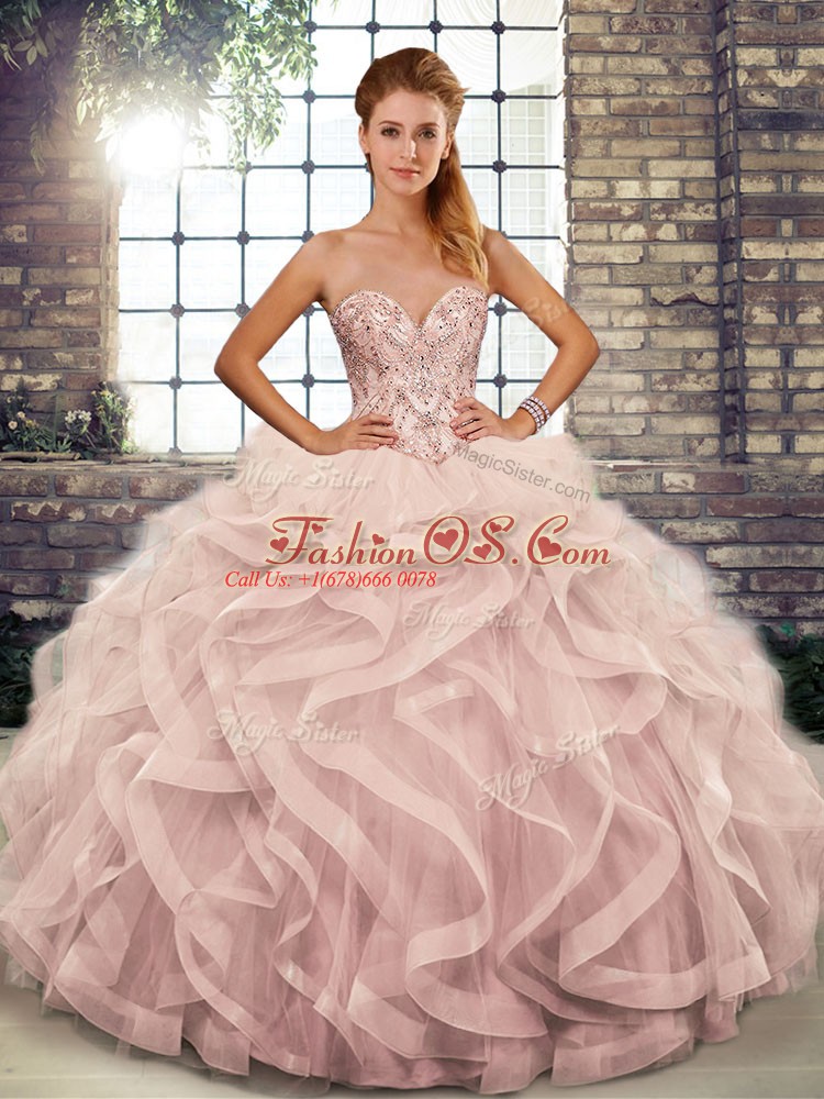 Most Popular Pink Tulle Lace Up Quince Ball Gowns Sleeveless Floor Length Beading and Ruffles