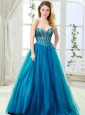 Most Popular Visible Boning Tulle Teal Modest Prom Dress with Beading