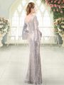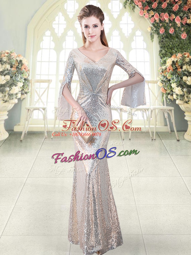 Most Popular V-neck Long Sleeves Prom Dresses Floor Length Ruching Silver Sequined