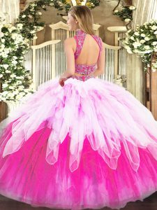 Multi-color Backless High-neck Beading and Ruffles Sweet 16 Quinceanera Dress Tulle Sleeveless