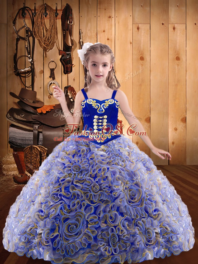 Home >  Special Occasion Dresses >  Pretty Little Girl Pageant Dresses > Multi-color Fabric With Rolling Flowers Lace Up Straps Sleeveless Floor Length Little Girl Pageant Gowns Embroidery and Ruffles
