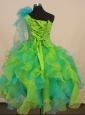 The top features the embroidery and beads while the one-shoulder neckline with a handmade flower matches the bottom perfectly. Layers of ruffles in contrasting colors gives you a touch of delicate beauty. A corset back completes the look.