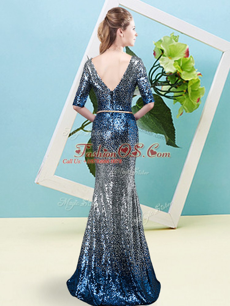 Multi-color Sequined Zipper Prom Gown Half Sleeves Floor Length Sequins and Belt
